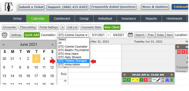 8. Select the Provider drop down box and verify you are able to select the Provider's name and view their calendar - see screenshot